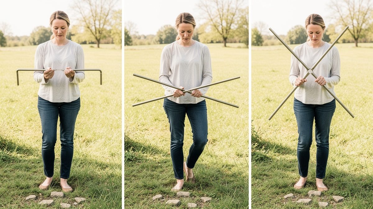 Les baguettes se croisent sous l'effet de micro-mouvements involontaires du sourcier, amplifiés par les variations du champ électromagnétique terrestre. Cette réaction traduit la présence d'eau souterraine, de métaux ou d'anomalies géologiques, résultant de contractions neuromusculaires inconscientes déclenchées par la sensibilité du praticien.
