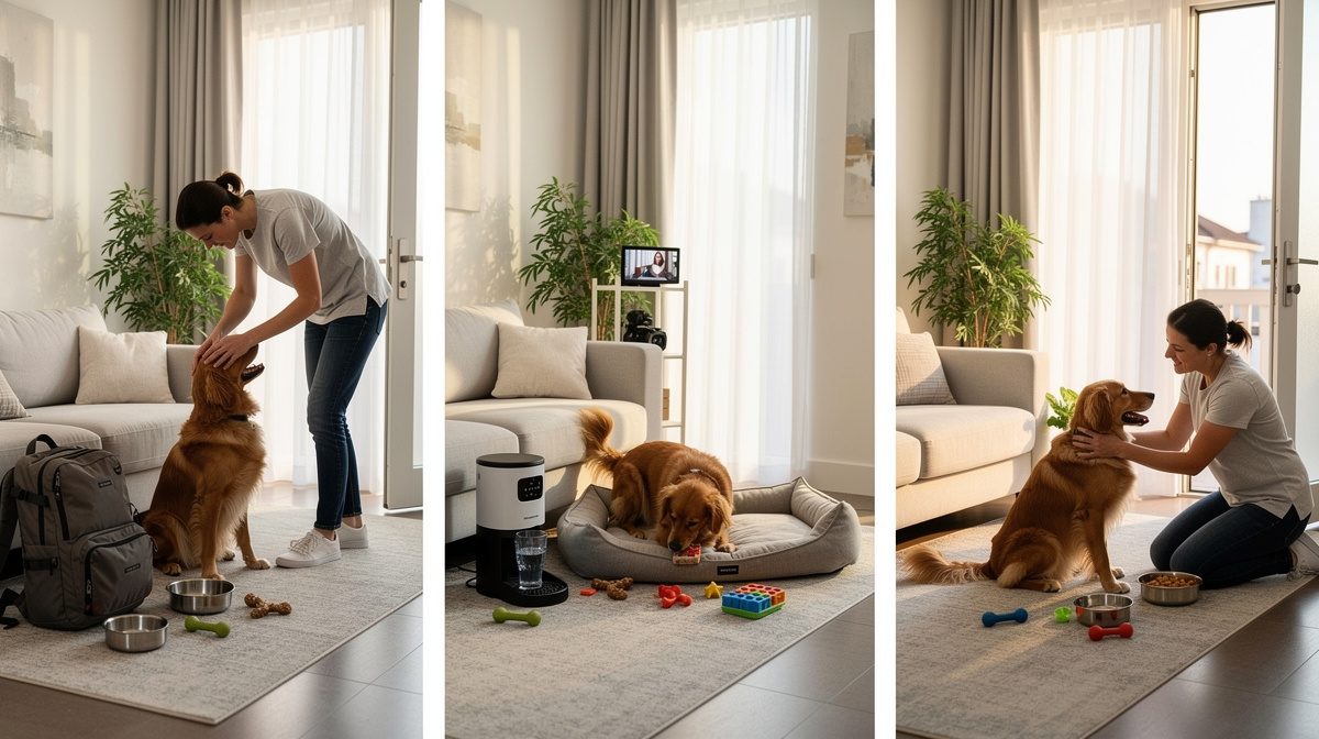 Installez votre chien dans une pièce calme où il a ses repères : panier, jouets familiers, gamelle d'eau fraîche. Les jouets d'occupation comme les Kong fourrés, les tapis de léchage ou les puzzles alimentaires stimulent mentalement l'animal et l'aident à passer le temps de façon constructive. Les produits à base de phéromones naturelles ou les fleurs de Bach recommandées par votre vétérinaire peuvent apaiser l'anxiété. Laissez un bruit de fond comme la radio ou la télévision pour éviter le silence total qui renforce le sentiment d'abandon. Si possible, donnez-lui accès à un espace extérieur sécurisé pour ses besoins. Les caméras connectées permettent d'observer le comportement de votre chien en votre absence et de détecter d'éventuels signes de détresse nécessitant une intervention.