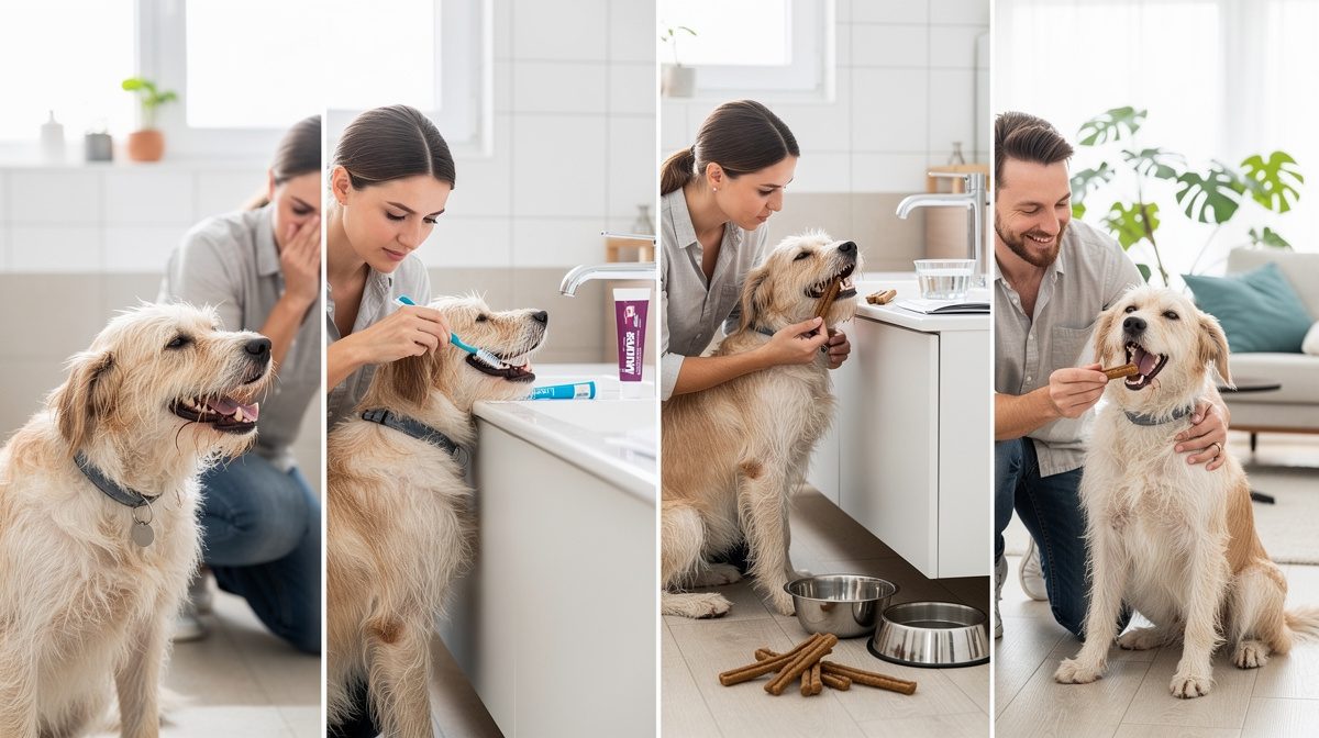 Le brossage régulier des dents constitue la meilleure solution pour prévenir et combattre la mauvaise haleine. Idéalement quotidien, il doit être effectué au minimum 2 à 3 fois par semaine avec un dentifrice spécifique pour chien. Ne jamais utiliser de dentifrice humain, car il n'est pas conçu pour être avalé et peut être toxique. Les dentifrices pour chien contiennent des complexes enzymatiques qui préviennent la plaque dentaire dès son premier stade. Utilisez une brosse à dents pour chien avec une tête triangulaire et un manche long pour atteindre les dents du fond, ou un doigtier en plastique souple recouvert de picôts abrasifs. Habituez votre chien progressivement dès son plus jeune âge : commencez par lui faire goûter le dentifrice, puis massez doucement ses gencives avec votre doigt avant d'introduire la brosse. Privilégiez la face externe des dents et ne prolongez pas trop la séance pour ne pas l'indisposer.