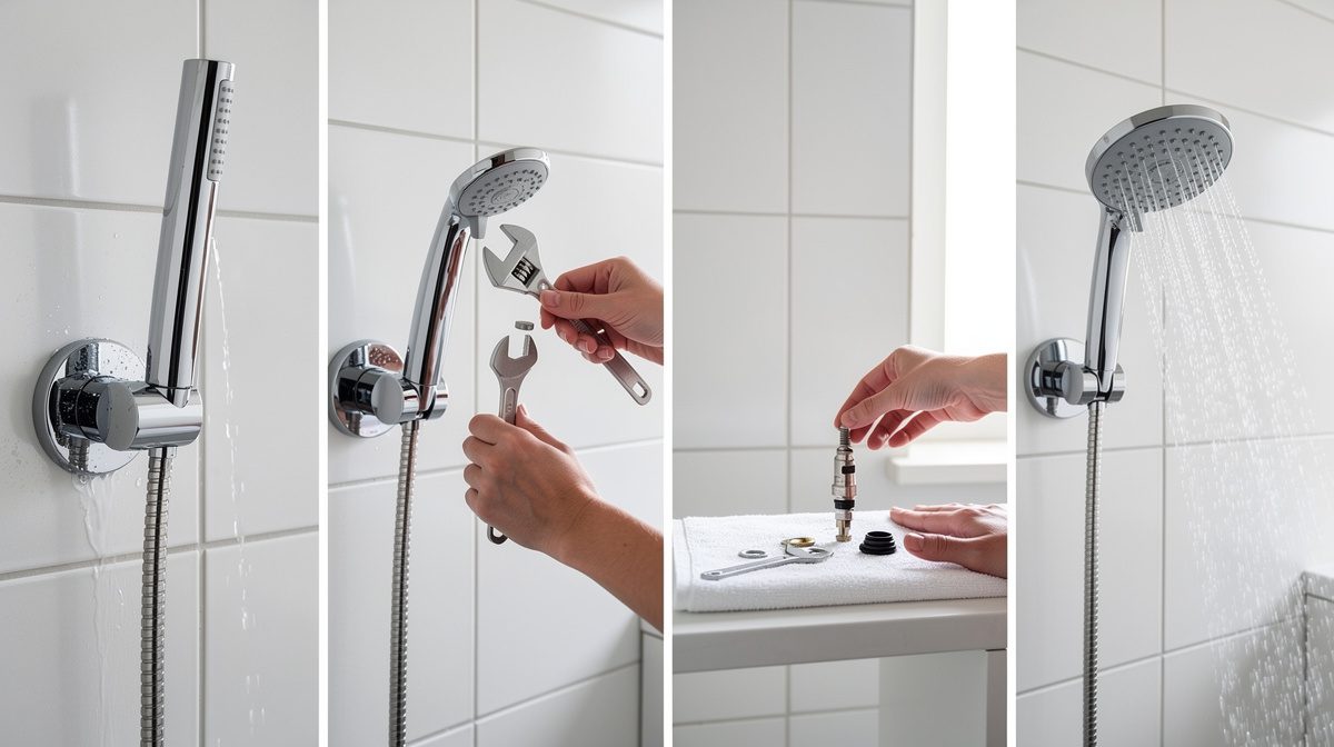 Une colonne de douche qui fuit provient généralement de joints usés, de raccords desserrés, d'une cartouche de mitigeur défectueuse ou d'accumulation de calcaire. La plupart des fuites peuvent être réparées en moins d'une heure en remplaçant les joints ou en resserrant les connexions.