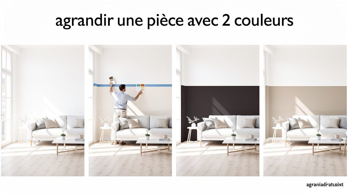 Pour agrandir une pièce avec 2 couleurs, appliquez une teinte claire sur les murs principaux et le plafond pour maximiser la luminosité, puis utilisez une couleur plus foncée sur un mur stratégique pour créer de la profondeur et corriger les proportions.