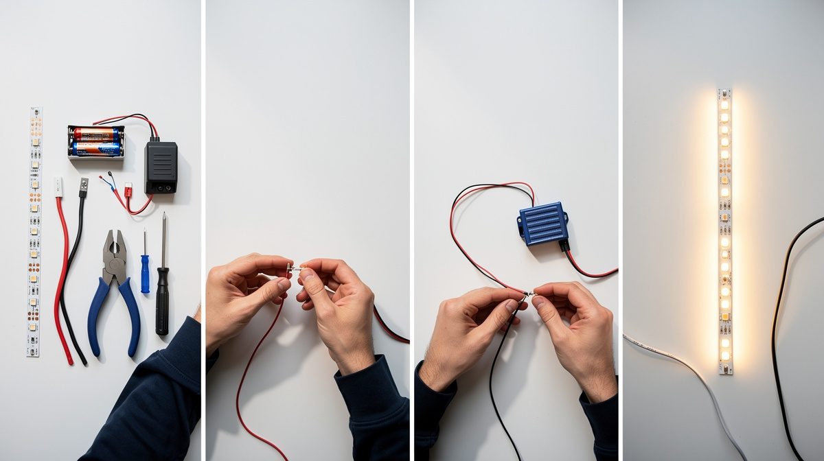 Rassemblez tous les éléments indispensables avant de commencer : votre source d'alimentation choisie, des connecteurs adaptés (jack mâle/femelle, dominos ou bornes à vis), des fils électriques de section appropriée (minimum 0,75 mm²), un tournevis, une pince coupante et une pince à dénuder. Pour les piles, un boîtier avec bouton on/off et jack mâle en sortie facilite grandement l'installation. Assurez-vous d'avoir des connecteurs compatibles entre votre batterie et vos LED. Si vous utilisez un power bank, vérifiez que vos LED disposent d'un port USB ou prévoyez un adaptateur. Pour les panneaux solaires, un régulateur de charge peut être nécessaire pour stabiliser la tension. Préparez également du ruban adhésif double face ou des clips de fixation selon votre support d'installation.