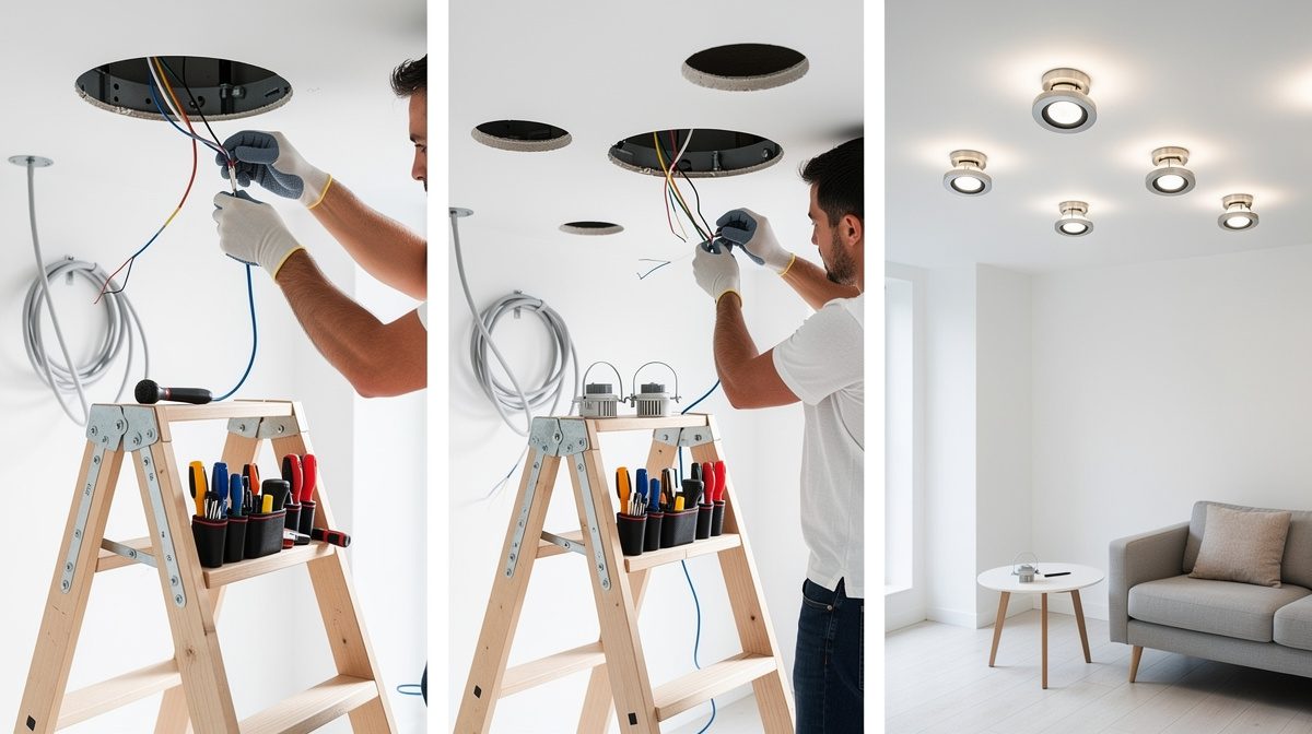 Pour brancher des spots, coupez d'abord le courant, identifiez si vos spots fonctionnent en 220V ou 12V (nécessitant un transformateur), percez le plafond aux emplacements prévus, raccordez les fils électriques (phase rouge, neutre bleu, terre jaune-vert) et installez des protections thermiques si le plafond est isolé.