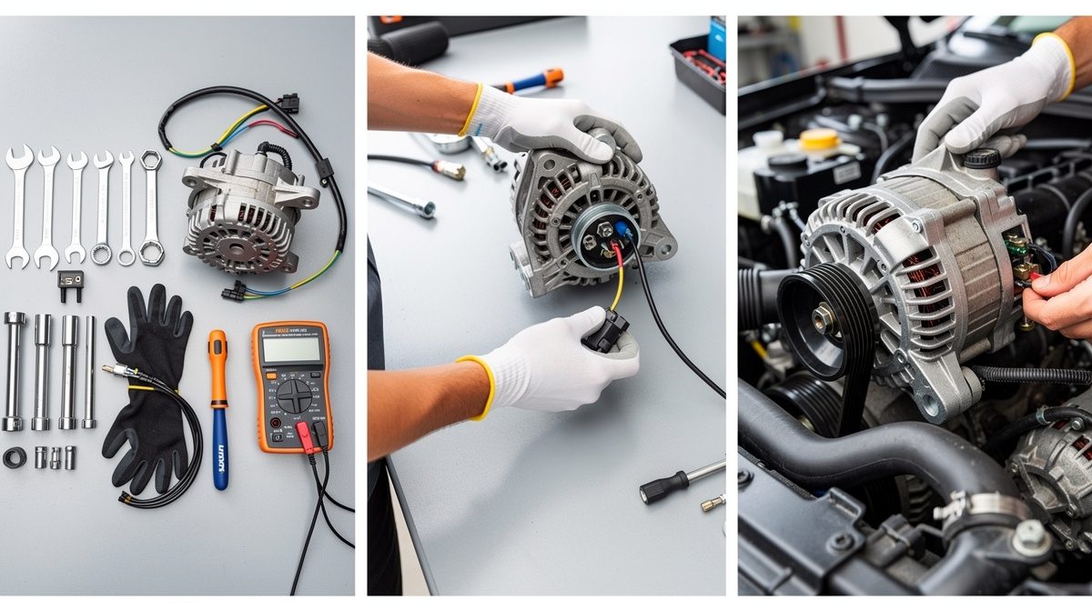 Pour brancher un alternateur, débranchez d'abord la batterie, fixez l'alternateur sur son support, connectez le câble B+ à la borne positive de la batterie, le fil D+ au voyant de charge, puis reliez la masse au châssis. Vérifiez ensuite la tension avec un multimètre : elle doit se situer entre 13,8V et 14,8V moteur tournant.