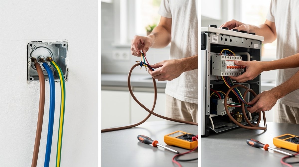 Repérez les trois fils qui sortent du mur ou de la prise 32A. Le code couleur normalisé est essentiel : le fil marron, rouge ou noir représente la phase, le fil bleu correspond au neutre, et le fil vert et jaune symbolise la terre (mise à la terre obligatoire). Si votre cuisinière possède un câble pré-installé, vérifiez qu'il s'agit bien d'un câble de type H05RR-F, conçu pour supporter des charges élevées. Si vous devez installer un nouveau câble, choisissez un modèle de qualité conforme aux normes avec une section de 6 mm². Dénudez délicatement l'extrémité des fils sur environ 1 cm à l'aide d'une pince à dénuder, en veillant à ne pas endommager les brins de cuivre. Vérifiez que les fils sont en bon état, sans traces d'oxydation ou de détérioration.