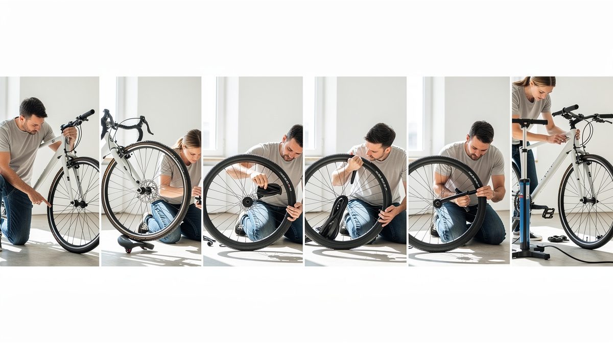 Avant de monter le pneu neuf, vérifiez la dimension exacte indiquée sur le flanc (par exemple 700×25C ou 29×2.10) et assurez-vous qu'elle correspond au diamètre et à la largeur de votre roue. Repérez également le sens de rotation du pneu, généralement indiqué par une flèche sur le flanc. Commencez par insérer un premier côté du pneu dans la jante en appuyant avec vos mains tout autour pour qu'il s'ajuste correctement dans le canal. Gonflez légèrement la nouvelle chambre à air (ou l'ancienne si elle est intacte) à environ la moitié de sa capacité. Introduisez ensuite la valve de la chambre à air dans le trou prévu sur la jante, puis placez progressivement le reste de la chambre à air à l'intérieur du pneu en suivant son contour.