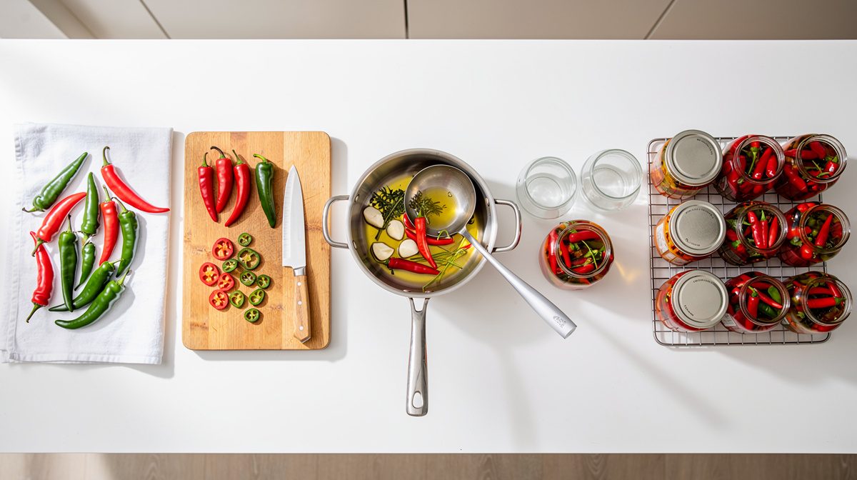 La stérilisation des contenants est une étape non négociable pour éviter toute contamination. Choisissez des bocaux en verre avec des couvercles à visser hermétiques. Lavez-les soigneusement avec du liquide vaisselle puis rincez-les abondamment. Plongez les bocaux et leurs couvercles dans une grande marmite d'eau bouillante pendant au moins 10 minutes. Certaines recettes recommandent de les placer au four à 100°C pendant 15 minutes comme alternative. Retirez-les ensuite avec des pinces propres et laissez-les sécher à l'envers sur un torchon propre et sec. Ne les essuyez pas avec un linge pour éviter de réintroduire des bactéries. Les bocaux doivent être complètement secs avant d'y déposer les piments. Cette précaution simple mais essentielle multiplie les chances de réussite de votre conserve et garantit une durée de conservation optimale.