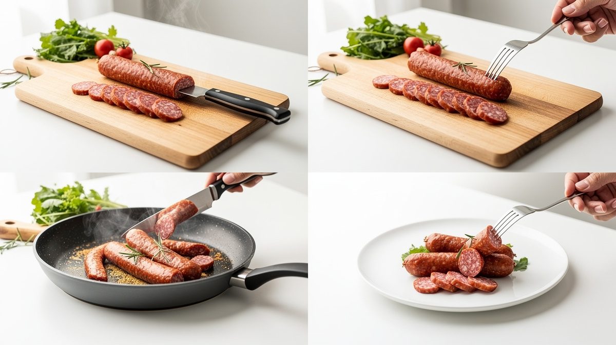 Pour cuire la longanisse fraîche, ne piquez jamais la saucisse avant cuisson, conseil répété par tous les charcutiers artisanaux. Retirez-la du réfrigérateur 15 minutes avant pour éviter un choc thermique. Faites chauffer une poêle à feu moyen sans ajout de matière grasse, car la longanisse libère naturellement son gras. Déposez la saucisse entière ou coupée en tronçons de 2 cm selon votre préférence. Faites-la revenir pendant 10 minutes en la retournant régulièrement jusqu'à obtenir une belle coloration dorée uniforme. La tradition pied-noire veut qu'on l'accompagne d'un œuf au plat pour un repas simple et savoureux. Vous pouvez également la servir avec des pommes de terre sautées aux herbes de Provence.