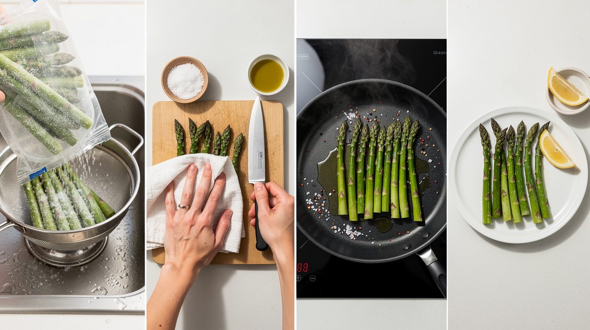 Sortez vos asperges congelées directement du congélateur juste avant la cuisson. Inutile de les décongeler : cette étape est même déconseillée car elle ramollit les tiges et fait perdre leur croquant naturel. Rincez-les rapidement sous l'eau froide pour éliminer les cristaux de glace et éviter les projections lors de la cuisson. Vérifiez qu'aucune partie abîmée ne subsiste, bien que les asperges congelées de qualité soient généralement déjà parées. La congélation crée des cristaux de glace dans les cellules : une décongélation libère cette eau et rend les tiges molles, alors que la cuisson directe préserve la texture ferme et les saveurs.
