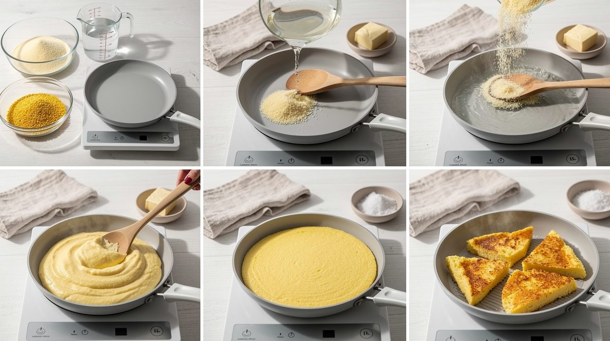 - Respectez le ratio liquide-polenta de 4:1 pour obtenir une consistance ferme adaptée à la cuisson à la poêle, comme le recommandent les experts culinaires