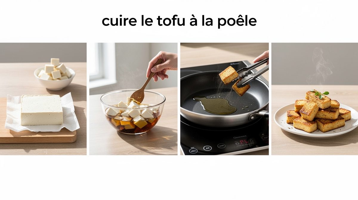 Pour cuire le tofu à la poêle, égouttez et pressez d'abord le tofu ferme pour éliminer l'excès d'eau, puis coupez-le en cubes ou tranches. Faites chauffer de l'huile dans une poêle bien chaude à feu moyen-vif, ajoutez le tofu et laissez-le dorer 2 minutes par face sans le bouger pour obtenir une texture croustillante à l'extérieur et moelleuse à l'intérieur.