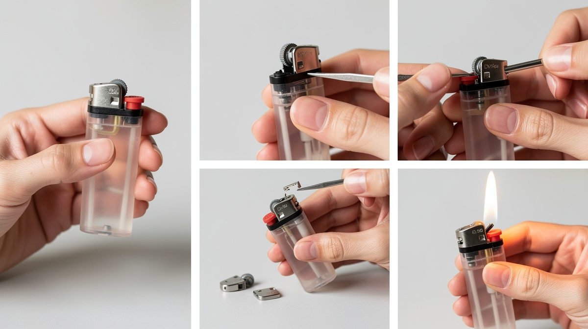 Pour un briquet standard à molette : soulevez délicatement la molette de réglage vers le haut tout en la tournant vers la droite (sens positif), puis abaissez-la. Vous pouvez ensuite retirer la petite pièce de limitation avec la pince à épiler. Pour un briquet Clipper : détachez la molette de réglage située à la base, vous verrez apparaître un petit ressort qui limite la taille de la flamme. Utilisez une pince pour l'enlever délicatement sans forcer. Pour un Zippo : démontez le mécanisme intérieur, retirez la mèche et le coton, puis rallongez la mèche de quelques millimètres avant de tout remonter. N'effectuez les ajustements que par petites étapes progressives. Ne forcez jamais sur les composants au risque de les endommager irrémédiablement.