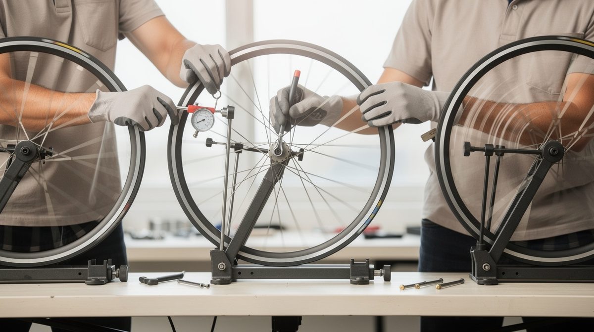 Une fois le voilage corrigé, vérifiez que la roue est bien centrée par rapport au moyeu. Utilisez un comparateur d'alignement en le plaçant d'un côté au contact de la jante et de l'axe, puis comparez avec l'autre côté. Si la jante est décentrée, ajustez tous les rayons d'un seul côté d'un quart de tour. Contrôlez ensuite la tension finale en pinçant les rayons deux par deux : vous devez sentir une tension similaire et homogène sur l'ensemble de la roue. Une tension trop faible peut entraîner de nouveaux voiles, tandis qu'une tension trop forte peut fragiliser la jante ou casser un rayon. Remontez le pneu et la chambre à air, puis testez la roue en la faisant tourner une dernière fois.