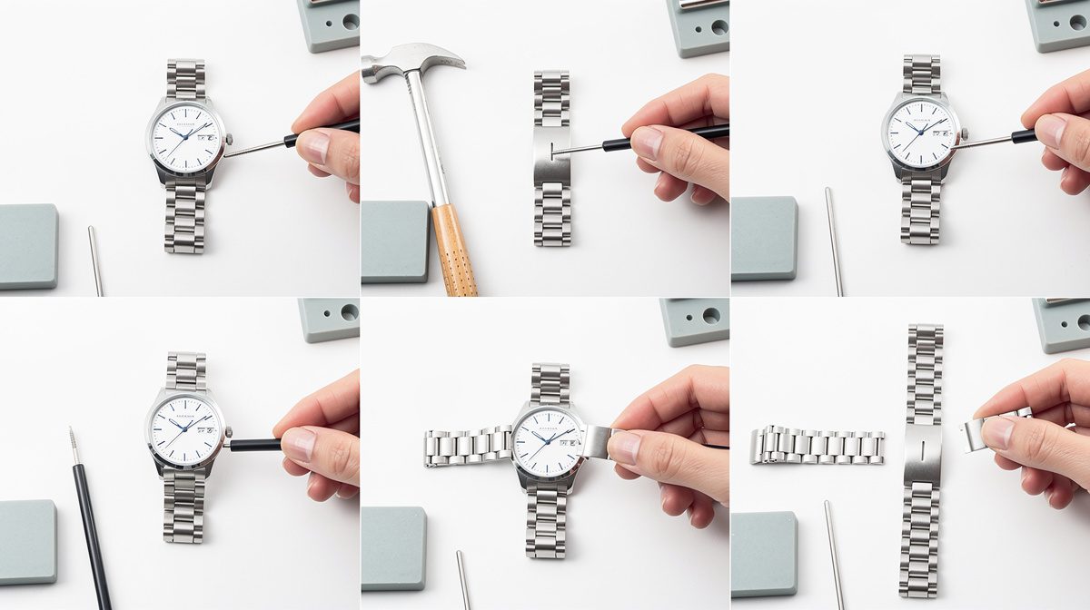 Une fois les maillons souhaités retirés, remettez les deux parties du bracelet ensemble en alignant correctement les trous. Prenez une goupille et replacez-la dans son axe en sens inverse des flèches, avec l'extrémité ronde vers le bas. Commencez par insérer la goupille à la main en appuyant fermement avec le doigt. Si elle ne rentre pas complètement, utilisez le chasse-goupille et le marteau en tapant délicatement pour l'enfoncer jusqu'au bout. Vérifiez que la goupille est enfoncée à la même profondeur des deux côtés du maillon en comparant avec d'autres goupilles non démontées. La goupille doit être parfaitement alignée et ne pas dépasser. Répétez l'opération pour chaque maillon réassemblé. Une fois le bracelet remonté, testez sa solidité en tirant doucement sur les maillons pour vous assurer que les goupilles sont bien en place. Essayez ensuite la montre à votre poignet pour confirmer que l'ajustement est confortable et que le fermoir est bien centré.