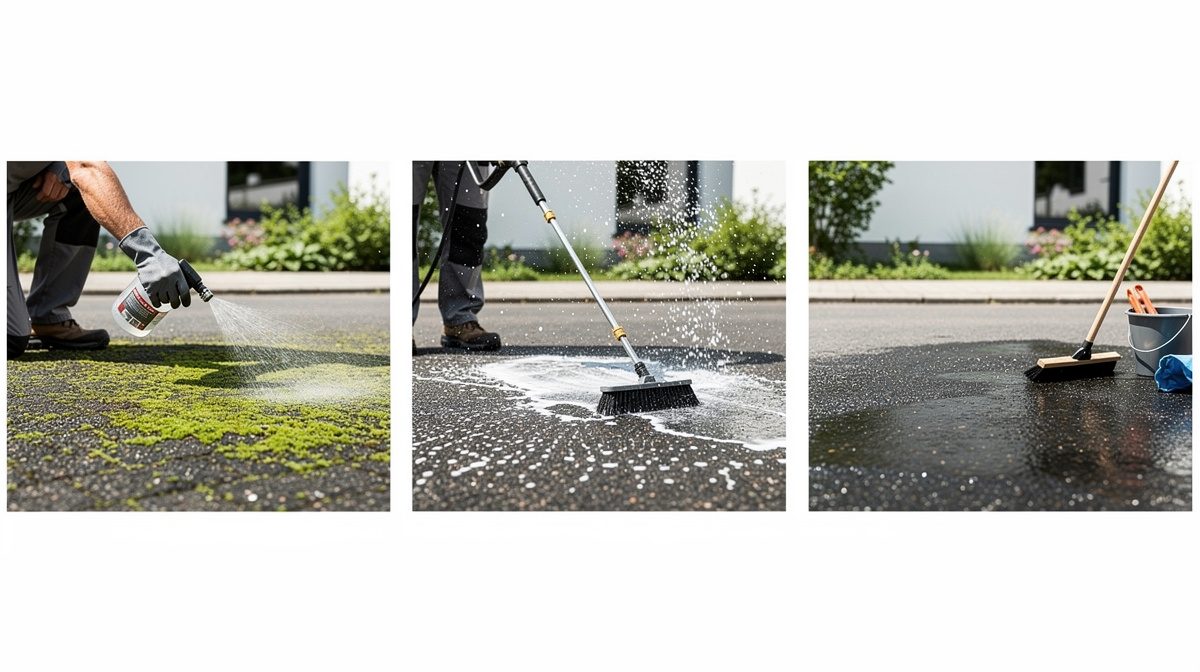 Si vous optez pour un nettoyeur haute pression, utilisez-le avec une extrême prudence pour ne pas endommager l'enrobé. Selon les experts d'Archzine, ne dépassez jamais 120 bars de pression, et restez sous les 100 bars pour un enrobé ancien. Utilisez uniquement un jet plat en éventail, jamais de rotabuse qui arracherait les granulats. Maintenez la lance à 40-50 cm de la surface et inclinez-la à environ 45 degrés. Le but est de balayer la saleté et les mousses ramollies, pas de décaper le bitume. Passez le jet méthodiquement sur toute la surface en commençant par les taches pour éviter qu'elles ne s'incrustent davantage. Cette méthode est particulièrement efficace après l'application d'un produit anti-mousse.