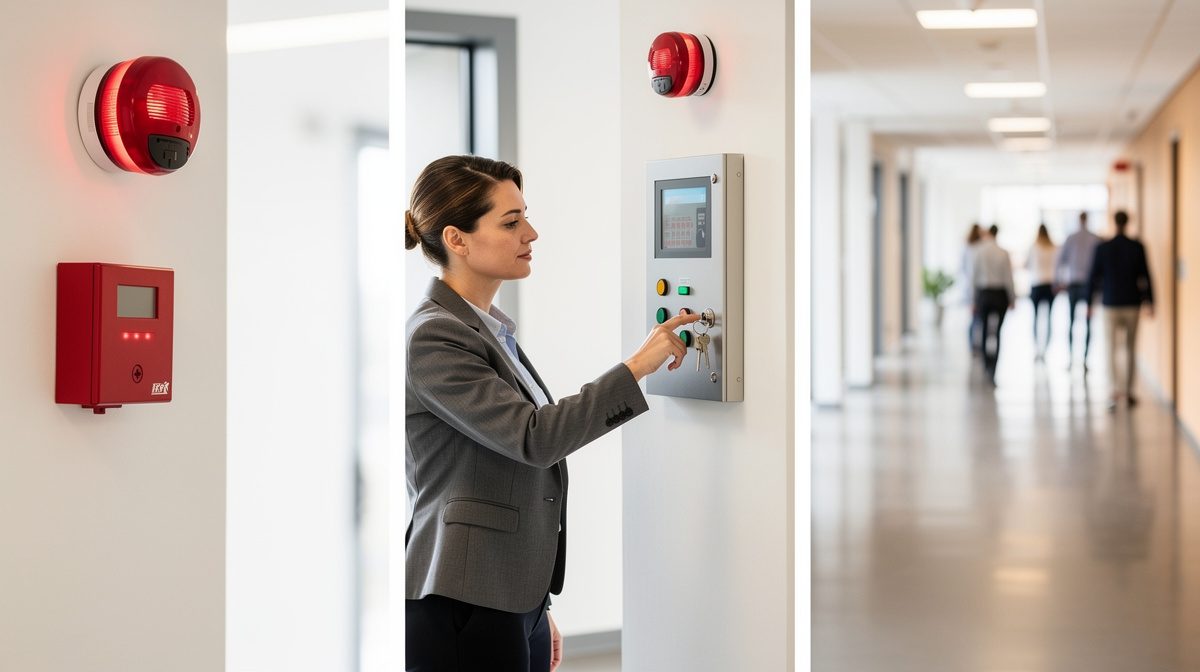 Dans les établissements recevant du public, le service incendie ou la personne en charge du système anti-incendie sont les mieux placés pour éteindre l'alarme. Le Code du Travail impose que le personnel soit formé à la conduite à tenir en cas d'incendie et à la manœuvre des moyens de secours.