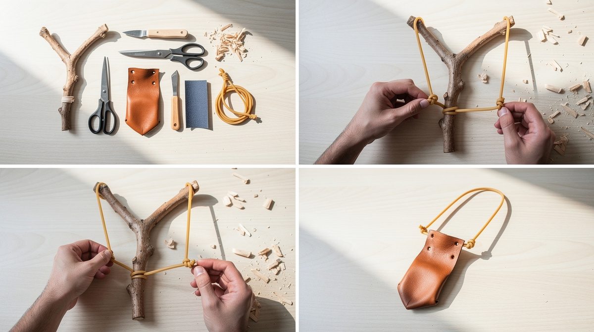 Pour fabriquer un lance-pierre, il faut une branche en forme de Y (chêne ou hêtre), des élastiques en latex naturel (comme le TheraBand Gold) et une pochette en cuir. Le montage consiste à préparer la fourche, fixer les élastiques dans des encoches et attacher la pochette centrale.