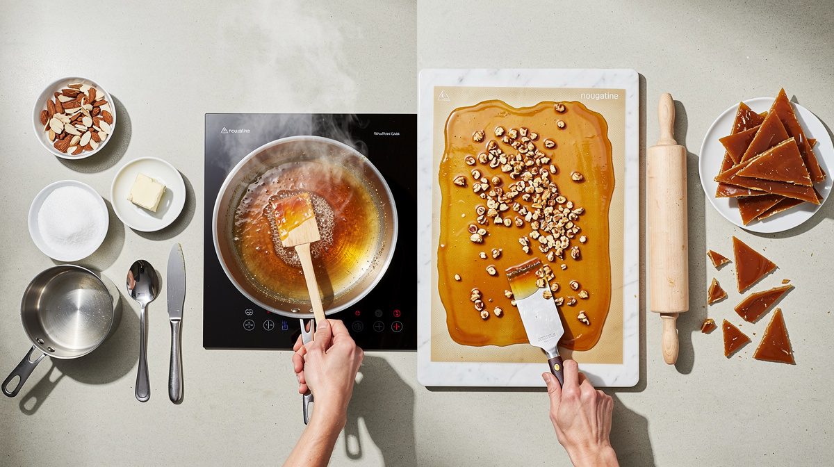 Pour faire de la nougatine, il faut cuire du sucre avec du glucose jusqu'à obtenir un caramel à 170-175°C, y incorporer des amandes effilées torréfiées, puis étaler rapidement le mélange entre deux feuilles de papier cuisson avant qu'il ne durcisse.