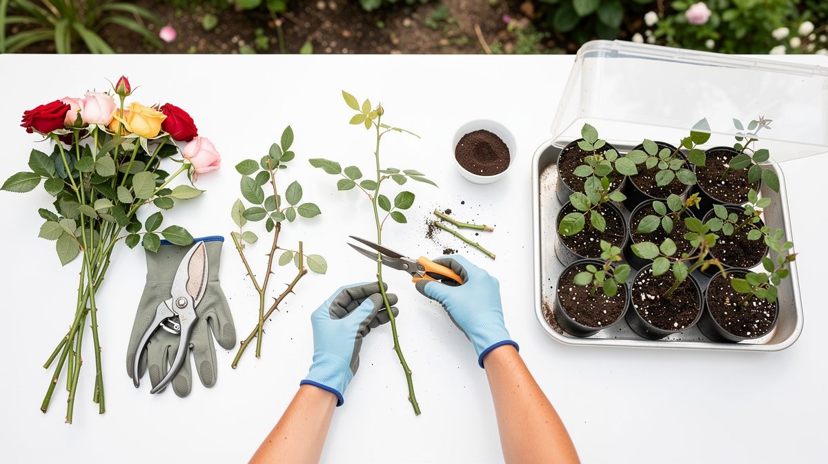La période optimale pour bouturer les rosiers se situe entre août et septembre, avec un pic de réussite en août selon les experts de Leaderplant. Les boutures prélevées durant cette période présentent un taux de réussite supérieur de 35% par rapport à celles réalisées en saison froide. Vous pouvez également bouturer de juillet à septembre pour les tiges semi-ligneuses. Préparez un sécateur bien affûté et désinfecté à l'alcool à 70° (ce qui réduit de 78% les risques d'infection), des pots de 8 à 10 cm de diamètre avec trous de drainage, un substrat drainant composé de 50% terreau et 50% sable de rivière, et de l'hormone de bouturage en poudre ou gel. Portez des gants de protection pour éviter les épines.