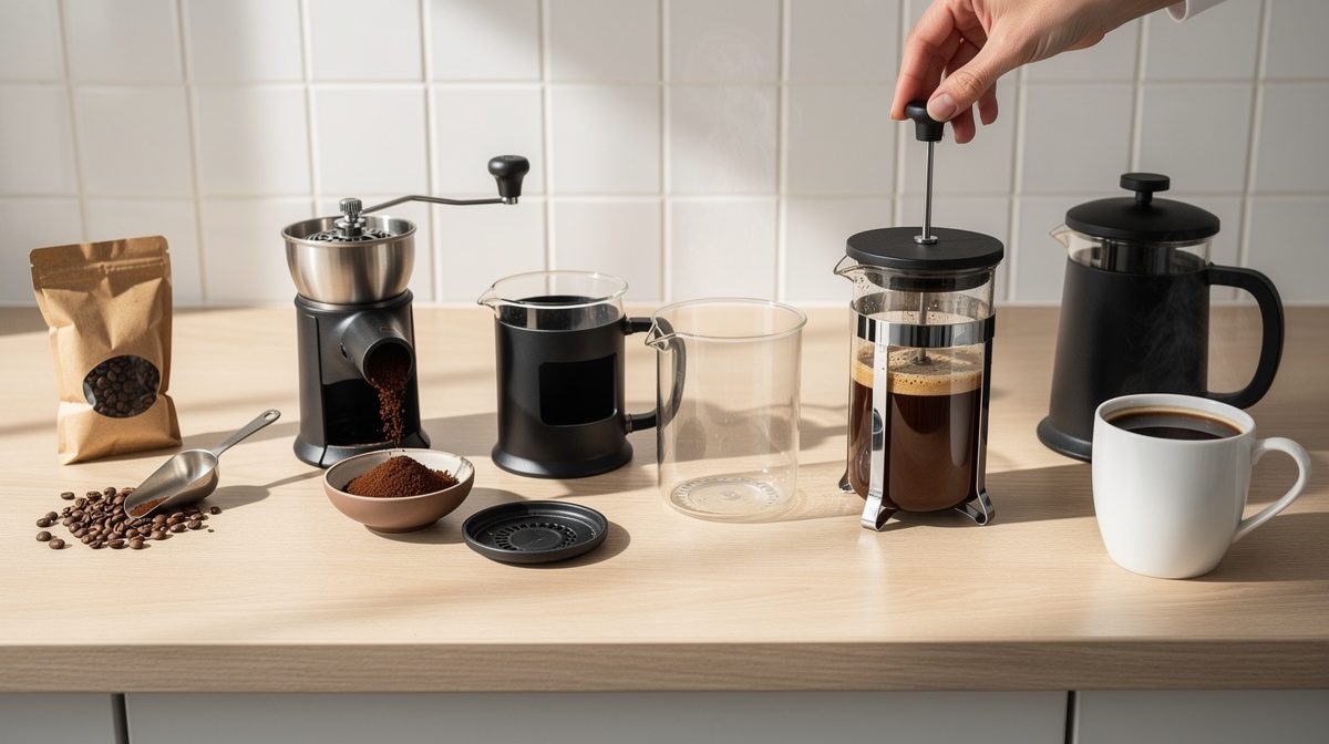 Pour une cafetière d'1 litre, utilisez 60 à 70 grammes de café moulu grossièrement, soit environ 8 à 10 cuillères à soupe. Ce ratio de 1:15 à 1:17 entre café et eau est recommandé par les baristas professionnels. Vous pouvez ajuster selon vos préférences : augmentez de 5 grammes pour un café plus corsé, diminuez pour un café plus léger.