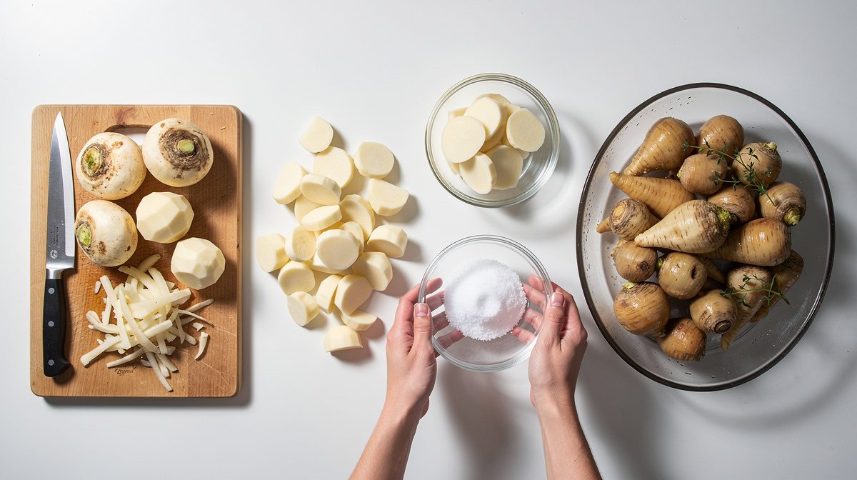 Choisissez des navets frais, fermes et sans taches, de préférence biologiques car les bactéries lactiques naturellement présentes sur leur peau sont essentielles à la fermentation. Lavez-les soigneusement sous l'eau froide pour éliminer les impuretés tout en préservant les bonnes bactéries. Épluchez ensuite les navets et parez-les en retirant les extrémités. Selon la tradition alsacienne, les navets sont détaillés en longues lanières fines qui rappellent des lacets blancs, à l'aide d'une mandoline, d'un robot ou d'une râpe grossière. Cette découpe permet une meilleure pénétration de la saumure et facilite la fermentation. Préparez environ 1 à 1,5 kg de navets pour remplir un bocal d'un litre.