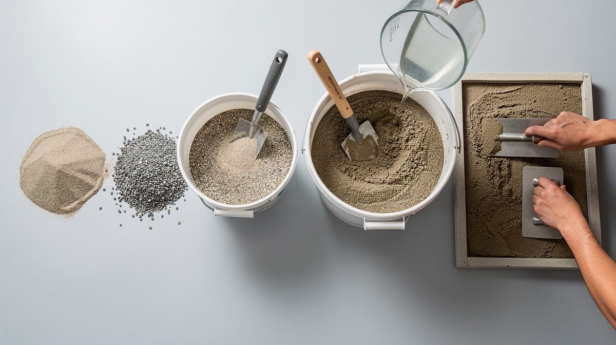 Dans votre bétonnière ou à l'aide d'une pelle dans une auge de maçon, mélangez d'abord le sable et le ciment à sec jusqu'à obtenir une couleur uniforme. Cette étape est cruciale pour garantir une répartition homogène du liant dans tout le volume. Le mélange doit être parfaitement sec avant l'ajout d'eau. Brassez pendant au moins 3 à 5 minutes pour éviter la formation de grumeaux de ciment. Pour vérifier la qualité du mélange, prenez une poignée et observez : la couleur doit être uniforme, sans traces blanches de ciment pur. Travaillez de préférence à l'ombre et évitez les températures inférieures à 5°C ou supérieures à 30°C qui peuvent affecter la prise du ciment.