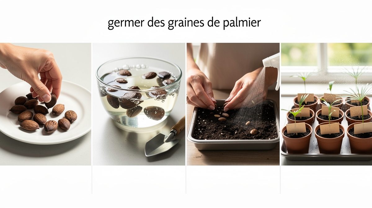 Pour faire germer des graines de palmier, nettoyez-les de leur pulpe, trempez-les 24 à 48 heures dans l'eau tiède, puis plantez-les dans un substrat drainant à 1-2 cm de profondeur. Maintenez une température constante de 25 à 30°C avec une humidité élevée sous mini-serre.