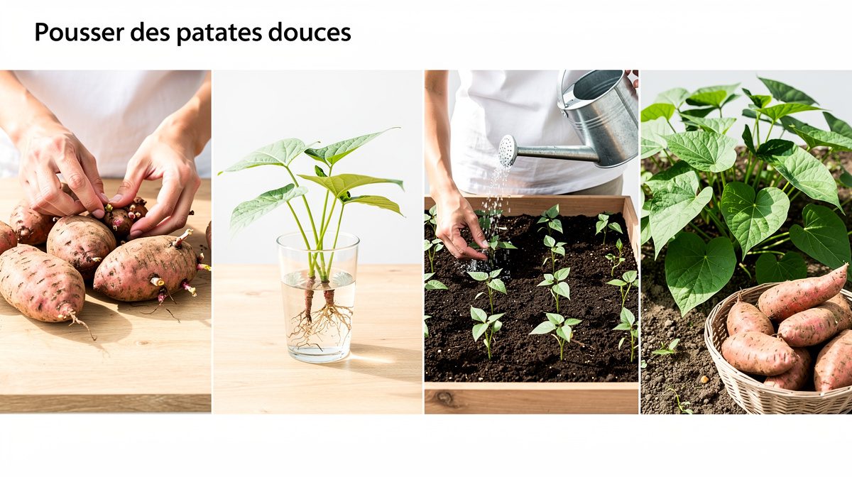 Pour faire pousser des patates douces, faites germer un tubercule à 25°C dès mi-février, bouturez les tiges en mars-avril, puis plantez en pleine terre en mai-juin quand le sol atteint 18-20°C. Récoltez après 100 à 150 jours, en septembre-octobre avant les gelées.