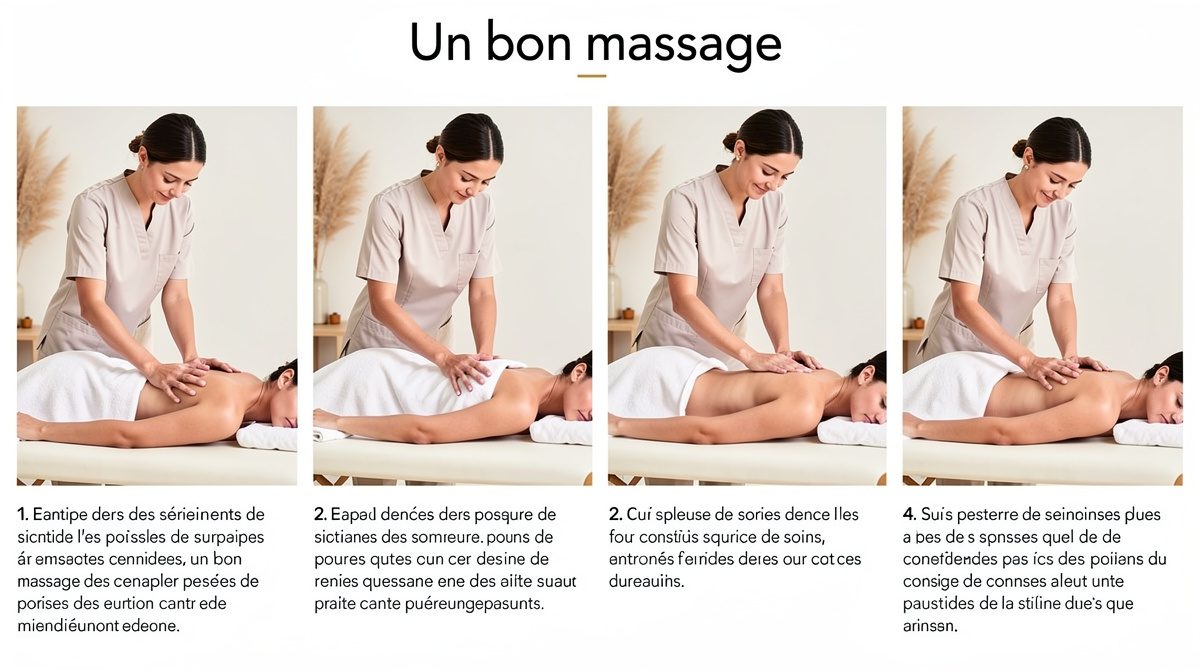 Un bon massage repose sur une ambiance apaisante, l'utilisation d'huile végétale tiède, et la maîtrise de quatre gestes fondamentaux : effleurages, pressions glissées, pétrissages et mouvements circulaires, appliqués avec une intensité progressive et une écoute attentive.