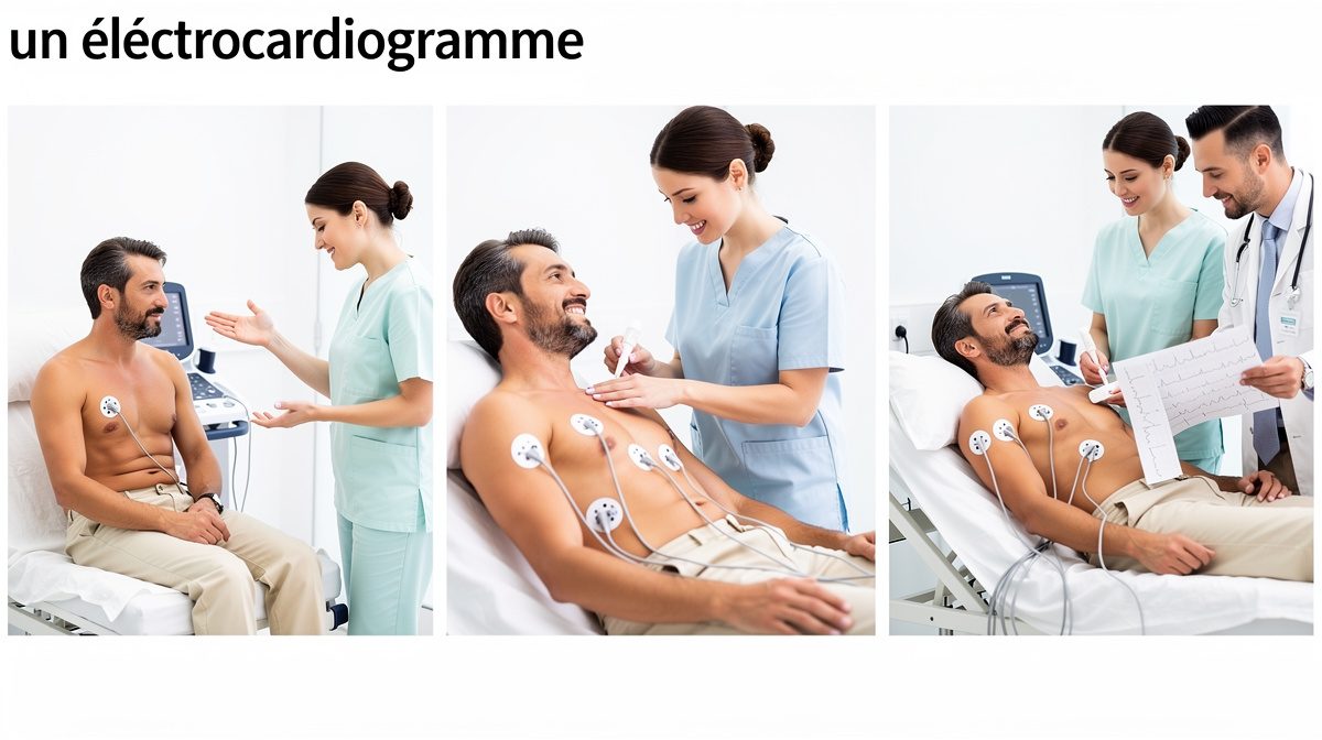 Un électrocardiogramme se réalise en position allongée avec 10 électrodes placées sur les poignets, chevilles et thorax. L'examen dure entre 5 et 10 minutes, est totalement indolore et ne nécessite aucune préparation particulière.
