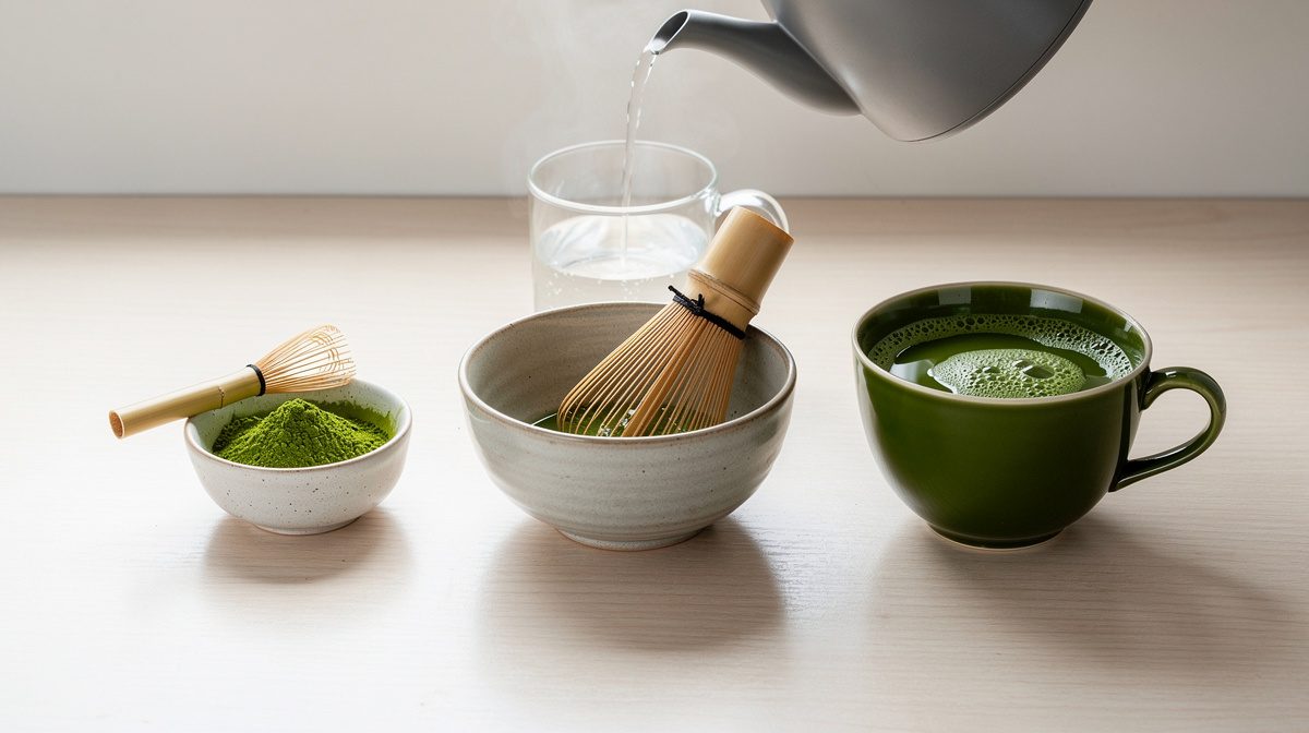 Pour préparer un thé matcha, tamisez 1 à 2 grammes de poudre dans un bol, versez 60 à 80 ml d'eau chauffée à 70-80°C, puis fouettez énergiquement avec un chasen en bambou en formant des mouvements en M ou W jusqu'à obtenir une mousse onctueuse.