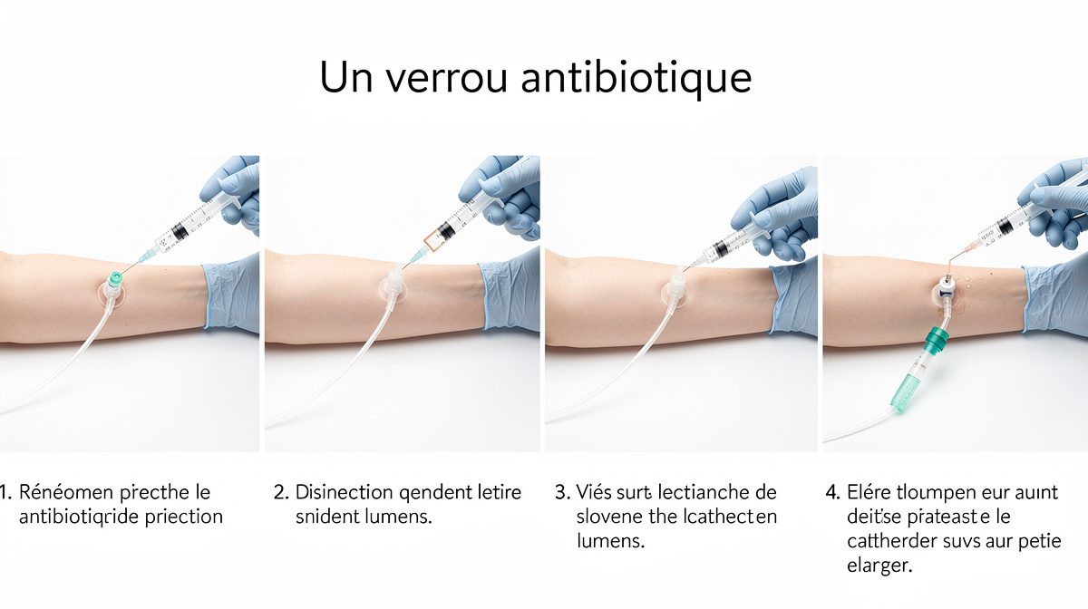 Un verrou antibiotique consiste à injecter 2 à 3 mL d'antibiotique hautement concentré dans le cathéter et à le laisser en place 12 à 24 heures. Cette technique permet de traiter les infections de cathéter sans ablation, avec un taux de succès de 82% pour les cathéters tunnelisés selon les études.