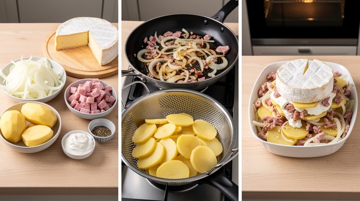 La tartiflette se prépare en faisant cuire des pommes de terre à l'eau, en les mélangeant avec des oignons et lardons revenus, puis en disposant le tout dans un plat à gratin recouvert de reblochon coupé en deux (croûte vers le haut), avant d'enfourner 20 à 25 minutes à 200°C.