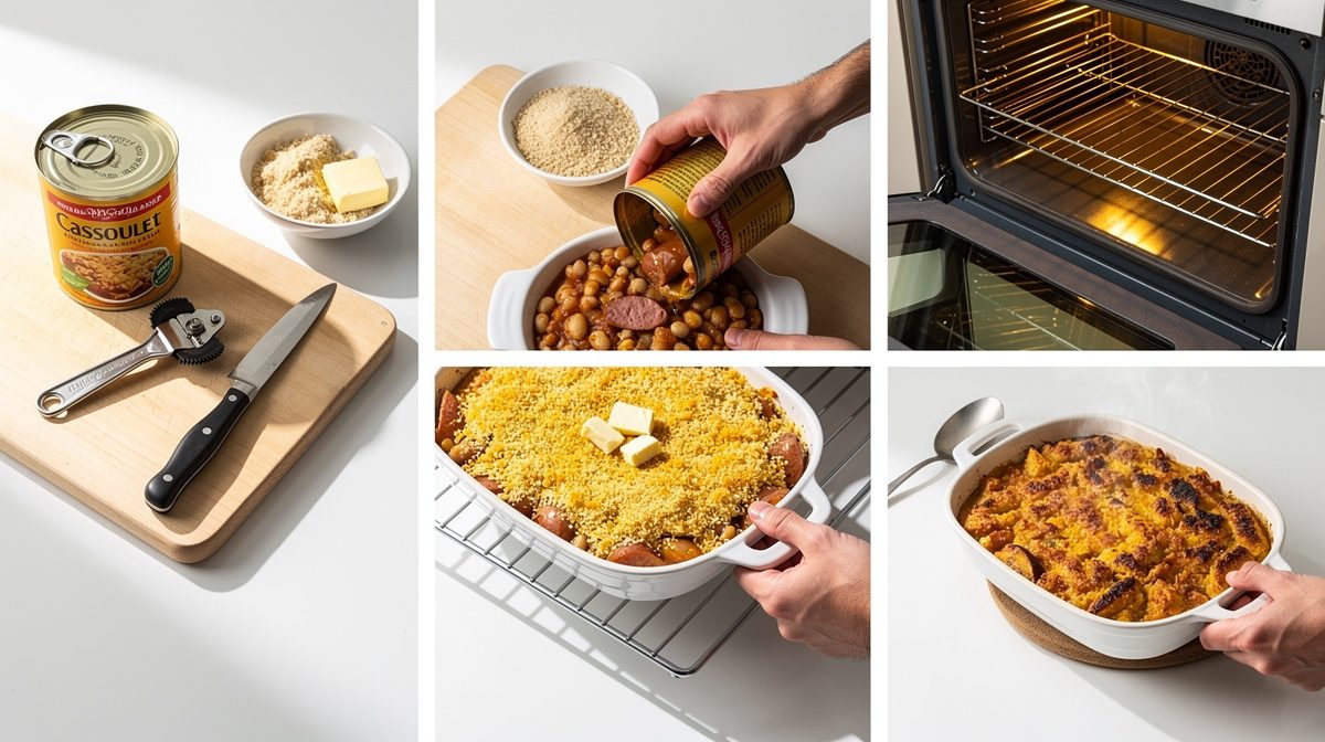 Pour gratiner un cassoulet en boîte, versez le contenu dans un plat allant au four, réchauffez à 180°C pendant 20-30 minutes, puis ajoutez de la chapelure et passez au grill à 220°C pendant 5-10 minutes jusqu'à obtenir une croûte dorée.