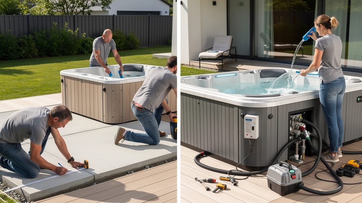 L'installation d'un spa nécessite une dalle béton d'au moins 10 cm d'épaisseur, un raccordement électrique dédié avec disjoncteur différentiel 30mA, et un emplacement stable sur un sol capable de supporter 450 kg/m². Le processus complet prend généralement une demi-journée avec l'intervention d'un professionnel.