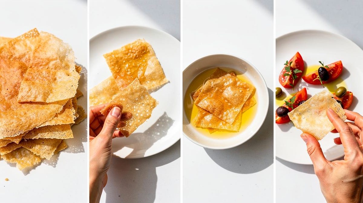 Le pane carasau ajoute un croquant délicieux aux salades composées. Cassez-le en morceaux directement au-dessus de votre salade, sans le ramollir au préalable. Les morceaux de pain vont absorber la vinaigrette ou la sauce, créant un contraste de textures intéressant entre les parties encore croquantes et celles légèrement assouplies. Cette technique fonctionne particulièrement bien avec des salades méditerranéennes à base de tomates, concombres, olives et feta. Vous pouvez aussi l'utiliser comme vous le feriez avec des croûtons dans une salade César revisitée. Le pain carasau remplace avantageusement le pain rassis dans les panzanella toscanes, apportant une texture plus raffinée et un goût de blé plus prononcé.