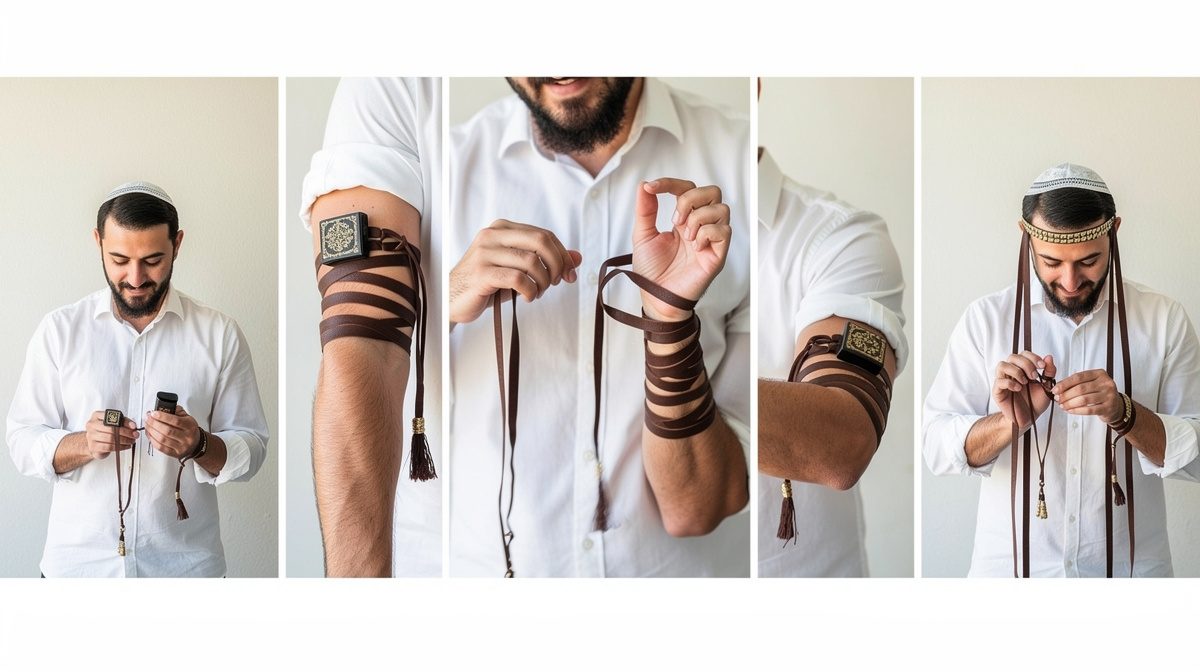 Pour mettre les téfilines, placez d'abord le boîtier du bras sur le biceps du bras faible (gauche pour les droitiers), récitez la bénédiction, puis enroulez la lanière 7 fois autour de l'avant-bras. Ensuite, positionnez le boîtier de la tête juste au-dessus du front, centré entre les yeux, et terminez en enroulant la lanière du bras 3 fois autour du majeur.