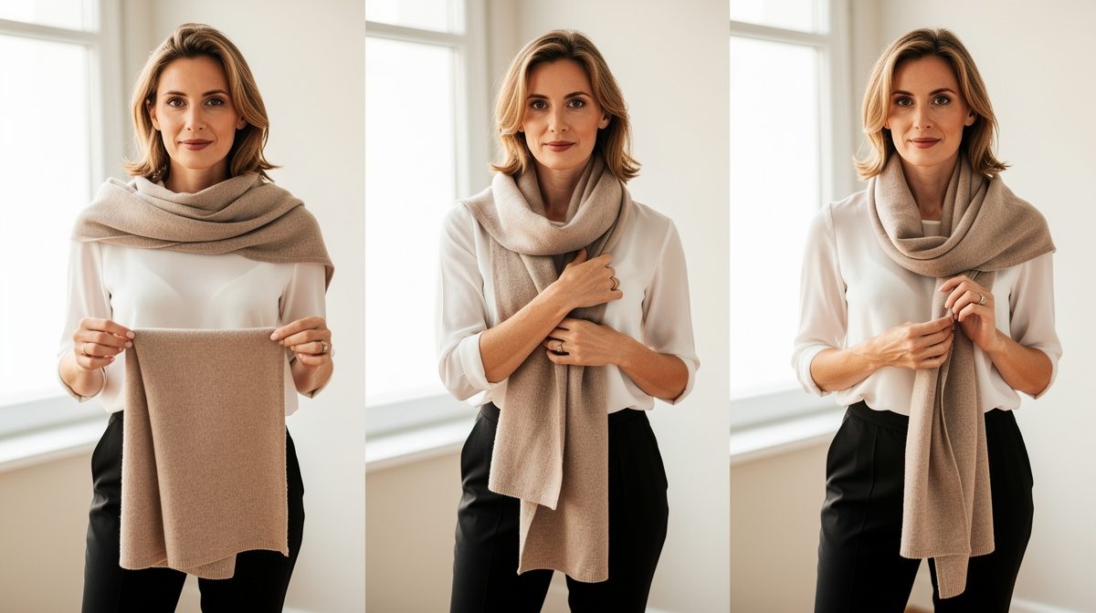 Pour un style plus sophistiqué et chaleureux, enroulez l'étole autour de votre cou comme une écharpe. Commencez par placer l'étole derrière votre nuque, puis passez les deux pans devant sur votre buste. Vous pouvez laisser les extrémités pendre librement (un pan devant et l'autre derrière) ou réaliser un nœud simple ou double légèrement lâche pour un effet élégant. Le nœud d'aviateur convient parfaitement pour un style casual : enroulez l'étole autour du cou avec les deux pans qui reviennent devant. Pour un look plus travaillé, vous pouvez aussi plier l'étole en deux dans la longueur, la draper par-dessus votre cou et nouer les extrémités en les insérant dans la boucle formée par l'extrémité pliée, créant ainsi le célèbre nœud parisien. Cette méthode est particulièrement efficace pour se réchauffer tout en ajoutant une touche sophistiquée à votre tenue, et elle fonctionne parfaitement avec des robes sans manches ou des hauts simples.