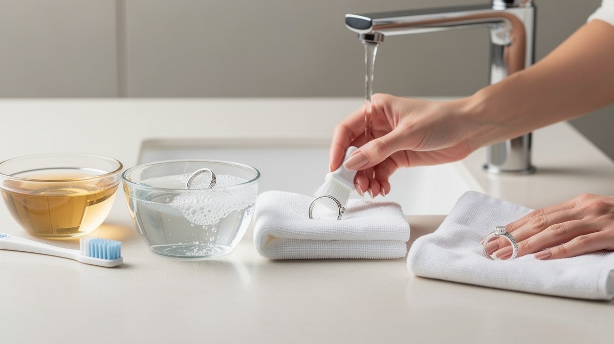 Utilisez une brosse à dents à poils souples ou une brosse à sourcils pour frotter délicatement toutes les surfaces de la bague. Insistez particulièrement sur les zones difficiles d'accès comme l'intérieur de l'anneau, les griffes du sertissage et les motifs ciselés où la saleté s'accumule. Effectuez des mouvements circulaires doux sans appuyer trop fort pour ne pas altérer la couche de rhodium. Selon les bijoutiers professionnels comme Trabbia Vuillermoz, cette étape nécessite plus de délicatesse pour l'or blanc que pour l'or jaune en raison de la fragilité du placage. Si votre bague comporte des pierres fines, nettoyez uniquement la partie métallique en évitant le contact direct avec les gemmes.
