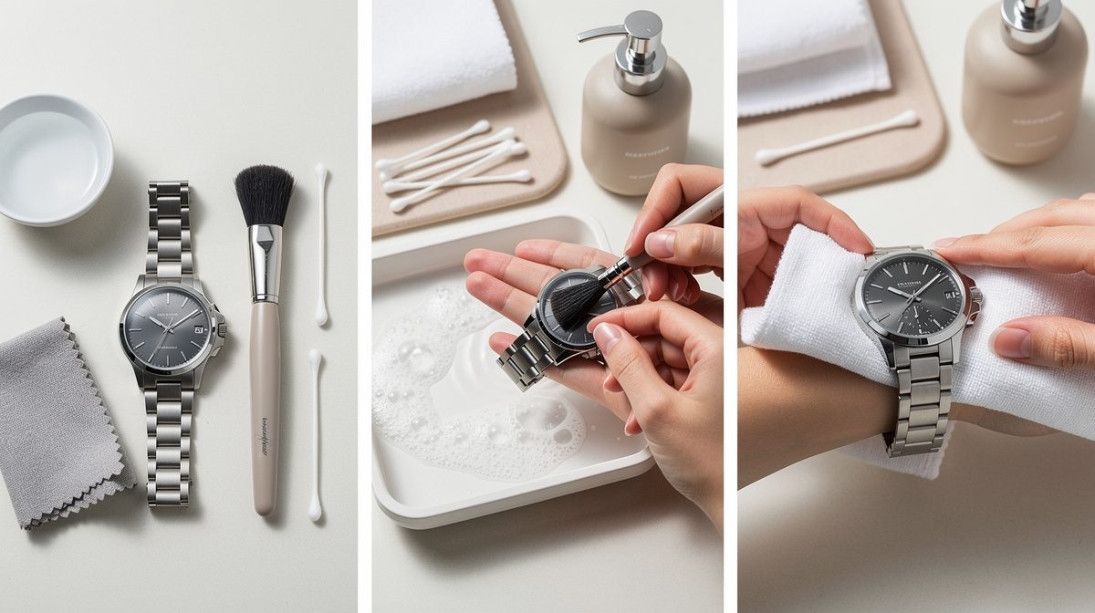 Pour nettoyer une montre, utilisez un chiffon doux sec pour les modèles non étanches, ou de l'eau savonneuse tiède avec une brosse à poils souples pour les montres étanches. Adaptez toujours la méthode au type de bracelet : eau savonneuse pour l'acier et le caoutchouc, chiffon sec uniquement pour le cuir.