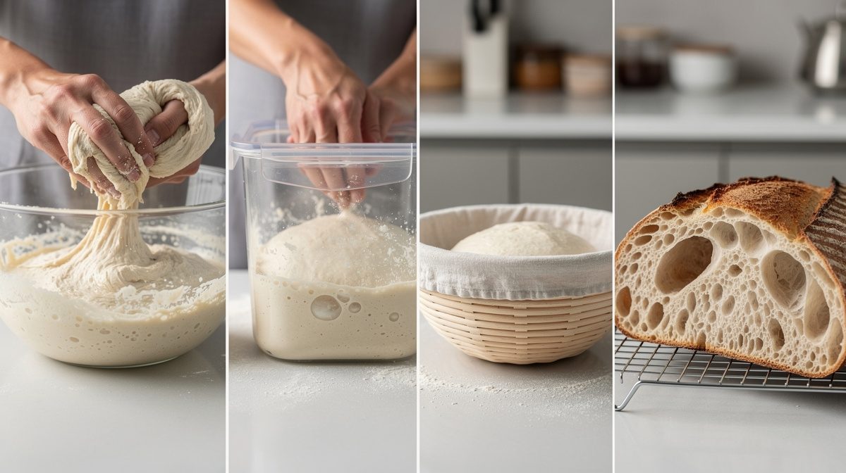 Après l'autolyse, ajoutez le sel, la levure ou le levain, puis pétrissez la pâte. Un pétrissage lent et court favorise un alvéolage irrégulier avec de grosses alvéoles, contrairement à un pétrissage mécanique intense qui produit une mie à petites bulles régulières. Pétrissez à vitesse lente pendant 7 à 8 minutes au robot, ou 10 minutes à la main en utilisant la technique de pression avec la paume. L'objectif est de développer suffisamment le réseau glutineux sans trop oxyder la pâte. Avec une pâte très hydratée (70-75%), privilégiez la technique des rabats (stretch and fold) plutôt qu'un pétrissage intensif. Effectuez 3 à 4 séries de rabats espacées de 30 minutes chacune. Cette méthode douce donne de la force à la pâte tout en préservant sa structure aérée.