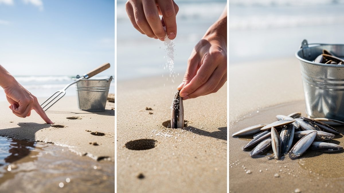 Pour pêcher les couteaux, repérez leurs trous en forme de 8 ou de serrure dans le sable à marée basse, versez une pincée de gros sel sur le trou, attendez quelques secondes que le couteau remonte à la surface, puis saisissez-le fermement par la coquille.