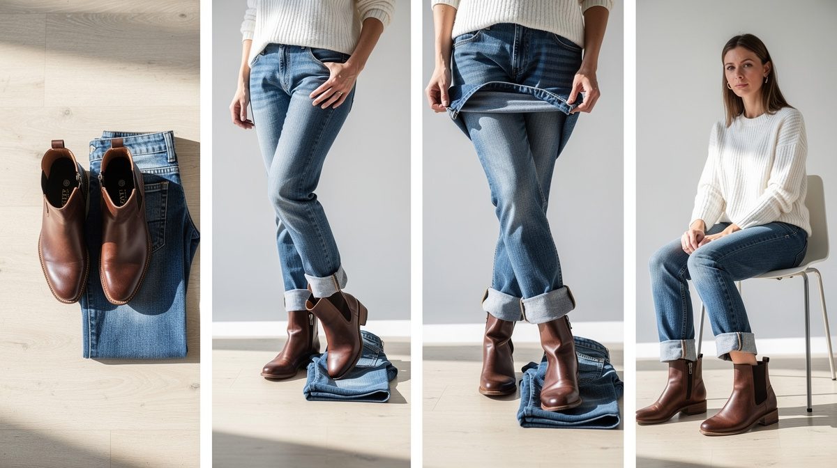 Avec un jean slim ou skinny, la longueur doit s'arrêter 2 à 3 cm au-dessus de la bottine pour mettre en valeur la jambe. Avec un jean droit, un léger retroussage dévoile la cheville. Pour un jean flare, le pantalon doit tomber sur la chaussure sans la recouvrir entièrement.