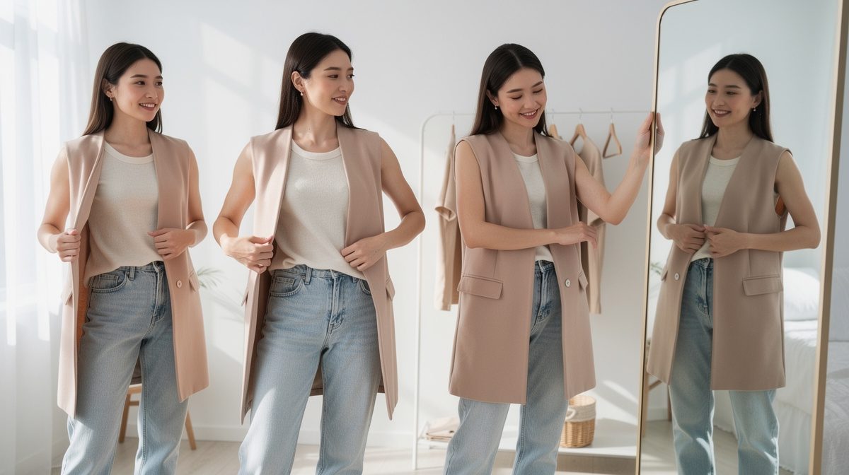 Pour un style casual et confortable sans négliger l'élégance, le gilet sans manche offre de multiples possibilités. Associez un gilet en maille oversize ou matelassé avec un pull fin ou un tee-shirt basique, un jean droit ou flare, et des sneakers ou bottes plates pour un look douillet et moderne, parfait pour un brunch ou une balade. La combinaison gilet sans manche sur chemise oversize est particulièrement gagnante : elle apporte du volume tout en structurant la silhouette. Rentrez légèrement la chemise dans votre pantalon pour un effet soigné. Pour un jean, privilégiez des coupes droites ou wide-leg plutôt que des skinny, en suivant la forme du gilet plutôt qu'en créant une compétition. Les baskets blanches sont idéales pour les journées détente, tandis que les bottines à talons créent le bon équilibre entre douceur et caractère.