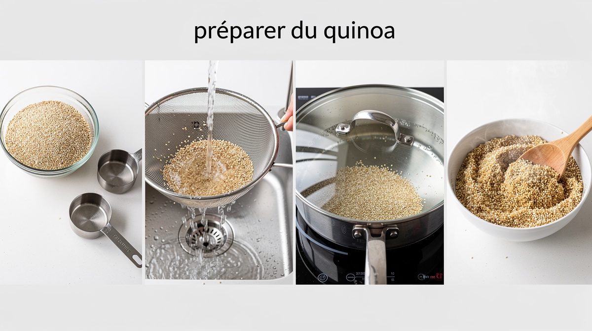 Pour préparer du quinoa, rincez-le abondamment 4 à 5 fois à l'eau froide pour éliminer la saponine amère, puis faites-le cuire 12 à 15 minutes dans 2 volumes d'eau pour 1 volume de quinoa. Laissez reposer 5 minutes hors du feu avant de servir.