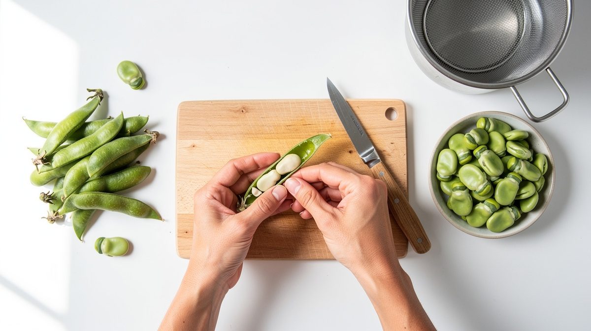 Préparer des fèves fraîches nécessite trois étapes : écosser les gousses, blanchir les graines 2-3 minutes dans l'eau bouillante, puis retirer la peau extérieure. Les fèves sont ensuite prêtes à être cuisinées selon vos envies.