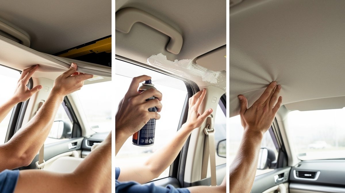 Pour recoller un ciel de toit, nettoyez et dégraissez les surfaces avec de l'alcool, appliquez une colle néoprène en spray sur le support et le tissu, patientez 5 à 10 minutes puis repositionnez en pressant fermement du centre vers les bords. Laissez sécher 24 heures avant utilisation.
