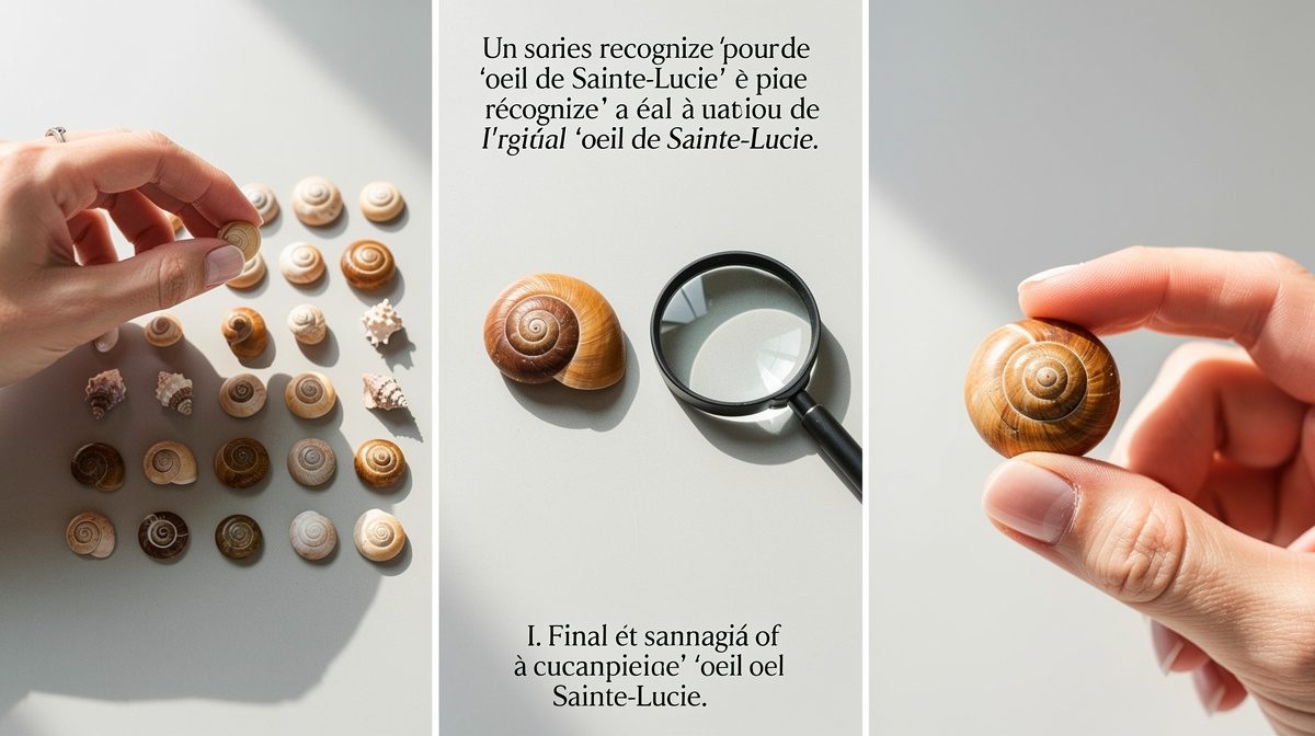 Un vrai œil de Sainte-Lucie méditerranéen se reconnaît à sa forme ovale allongée en oreille, sa face orange vif corail caractéristique et sa taille de 25 à 30 mm maximum. L'opercule asiatique dit œil de Shiva est plus rond, plus épais et présente des teintes marron, vertes ou bleues.