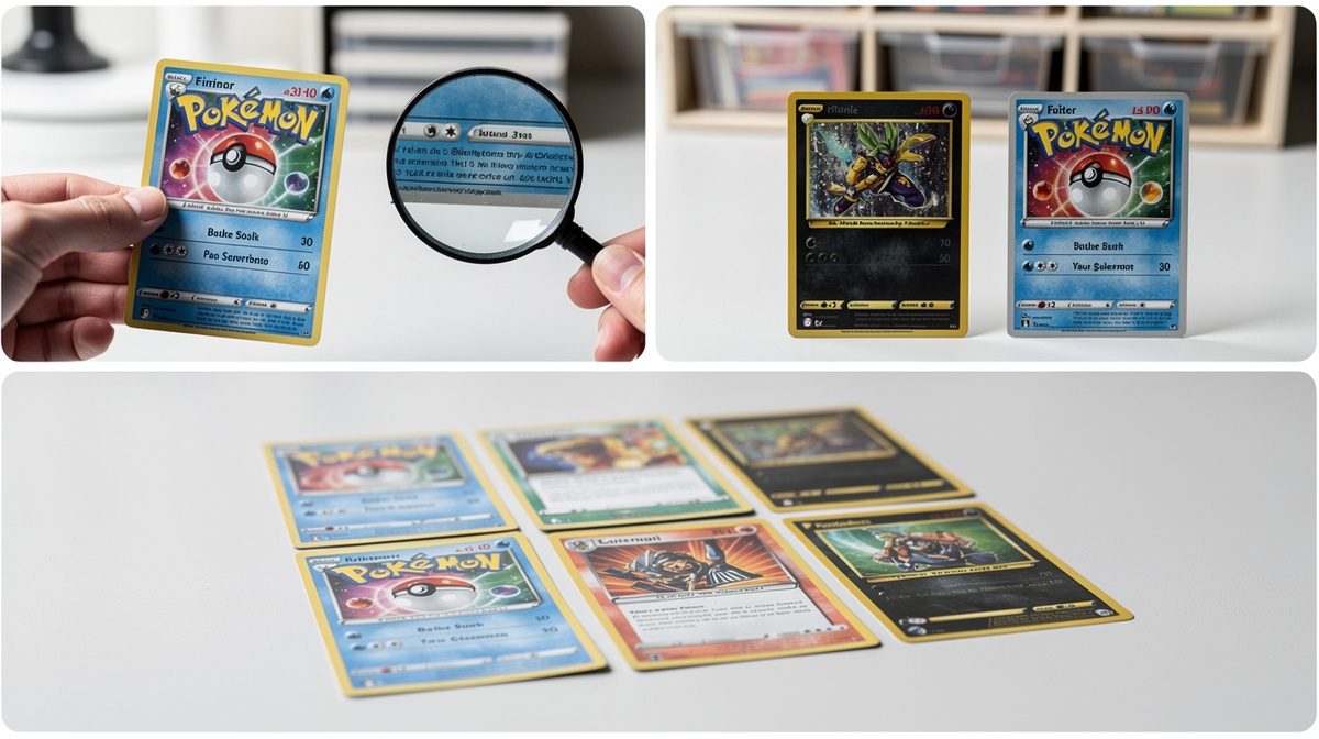 Une vraie carte Pokémon se reconnaît par sa texture légèrement granuleuse, son impression nette aux couleurs vives, sa couche noire visible sur la tranche et son poids d'environ 1,75 gramme. Les contrefaçons présentent généralement une surface trop lisse ou plastifiée, des couleurs altérées et des erreurs typographiques.
