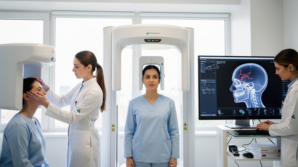 Un cone beam des sinus se déroule en quelques minutes seulement, sans préparation particulière. Le patient reste assis ou debout, la tête immobilisée, pendant que l'appareil effectue une rotation de 10 à 20 secondes autour de sa tête pour capturer des images 3D des sinus.